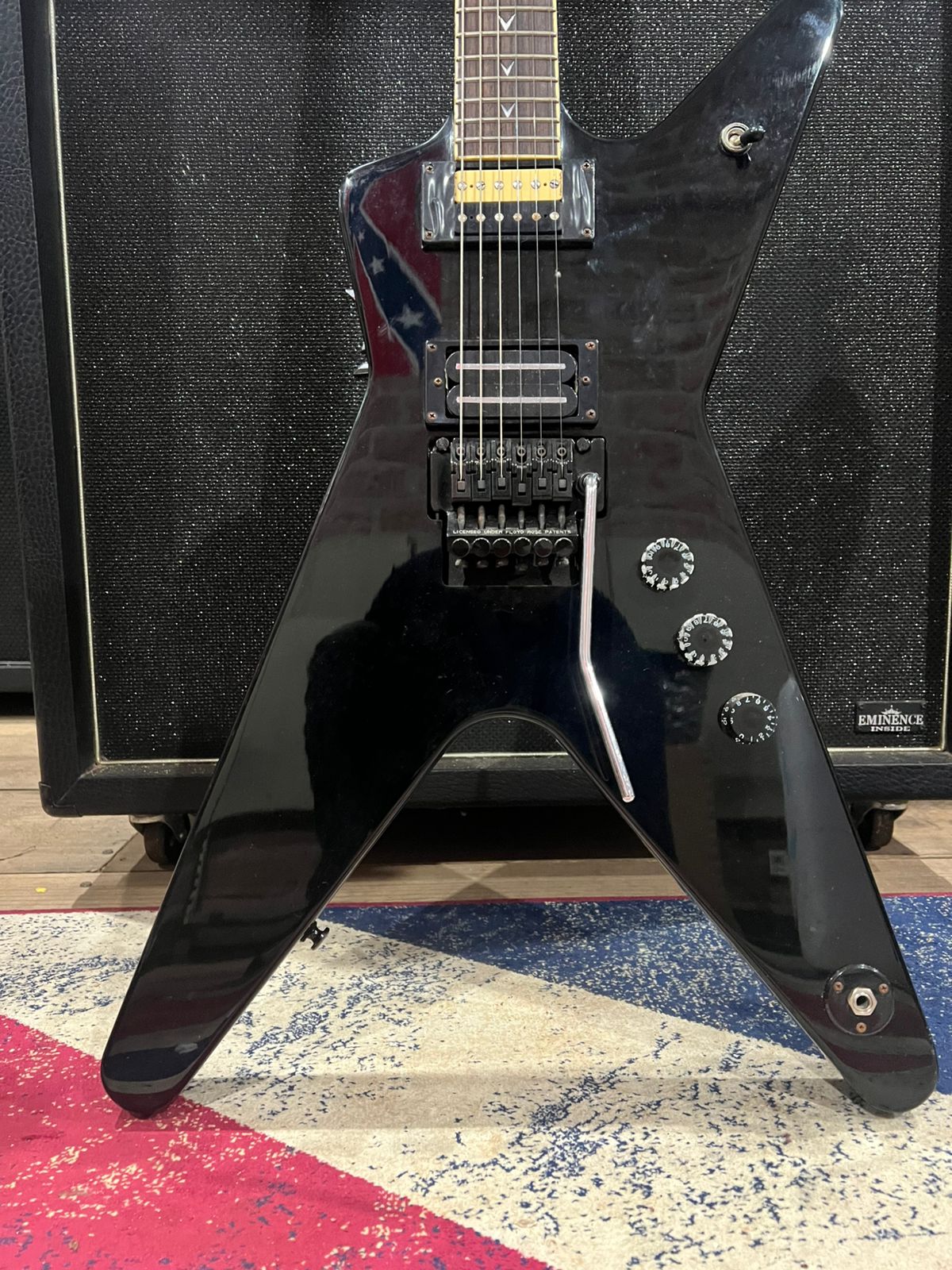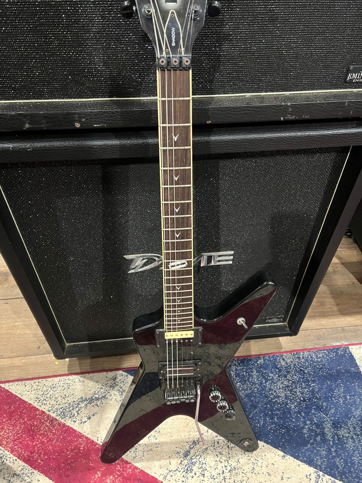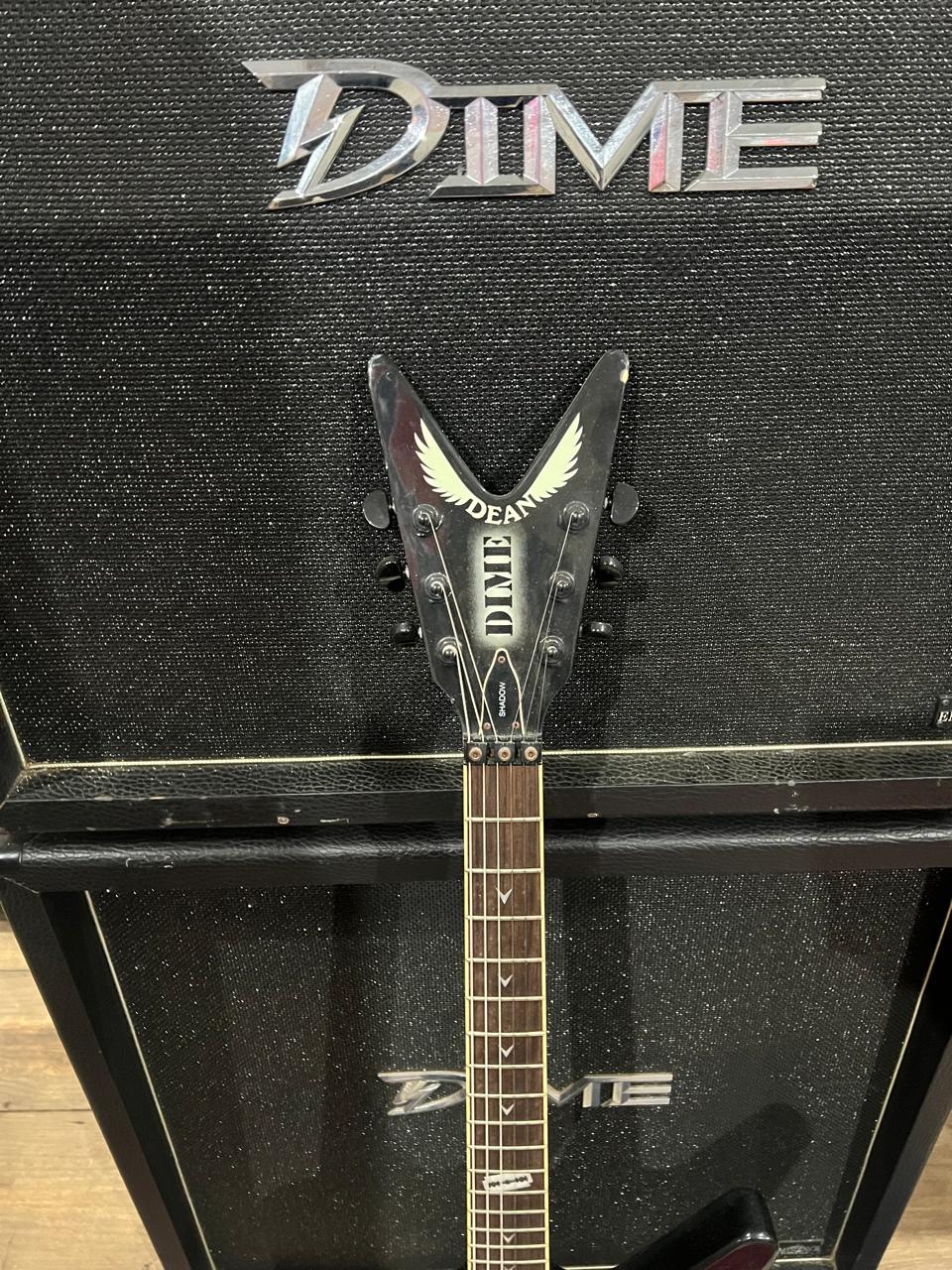 A Dean Dime Shadow ML é um guitarra elétrica em forma de ML com um corpo de mogno e um braço de mogno definido, apresentando uma escala de jacarandá com incrustações de navalha “Dime” de pérola. Equipada com um captador de ponte e braço DMT Design humbucker. A guitarra inclui um sistema de tremolo licenciado por Floyd Rose, afinadores Grover e botões de tração Dime, todos projetados para estilos de alto desempenho.